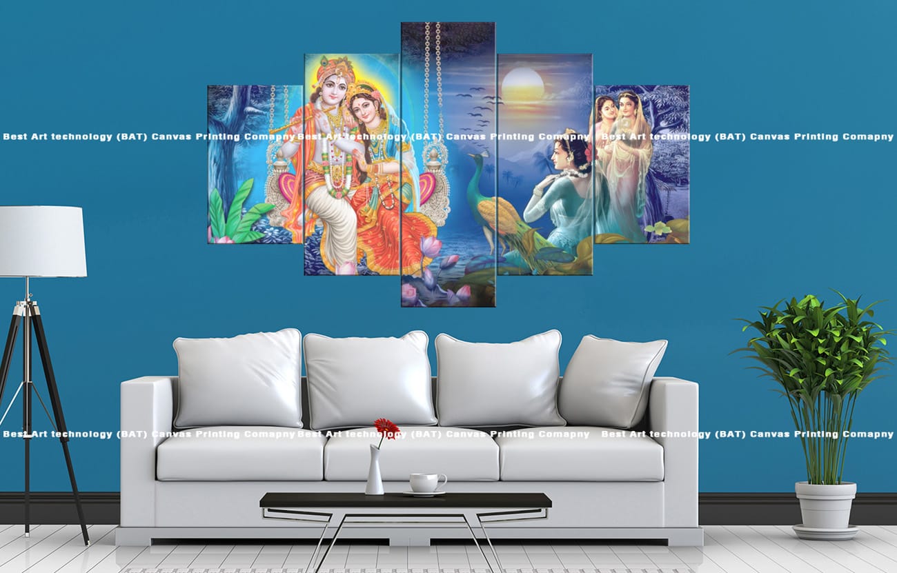 • Premium Quality Canvas Print: High-resolution multi-panel design featuring Radha and Krishna with a flute and peacocks under the moonlight.