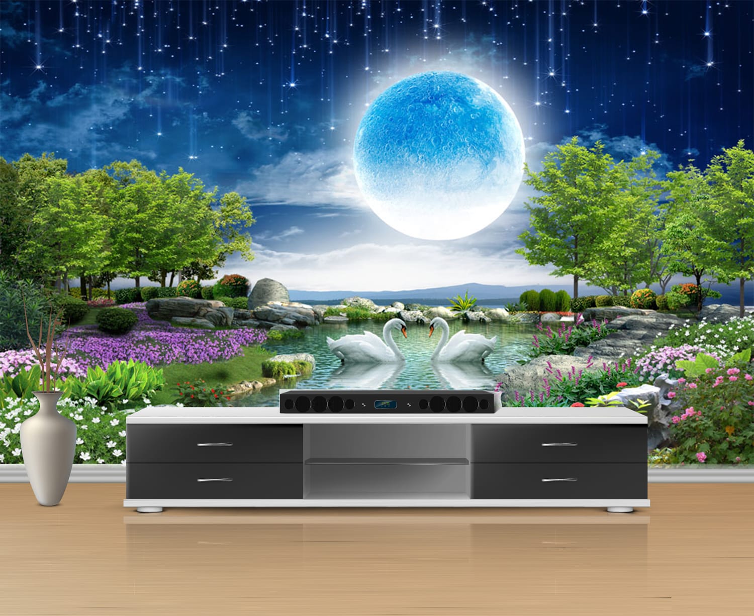 - Premium Quality Mural: High-resolution design showcasing a moonlit lake with swans and a beautiful garden under a starry sky.