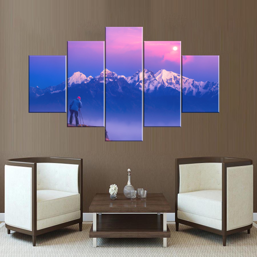 Introduce stunning natural beauty and a sense of peaceful contemplation to your space with this multi-panel canvas art featuring the Mountain Photographer Canvas Print. This captivating artwork showcases a snow-capped mountain range under a vibrant sunset or sunrise sky, painted with hues of pink and purple, with a lone photographer capturing the magnificent view in the foreground.