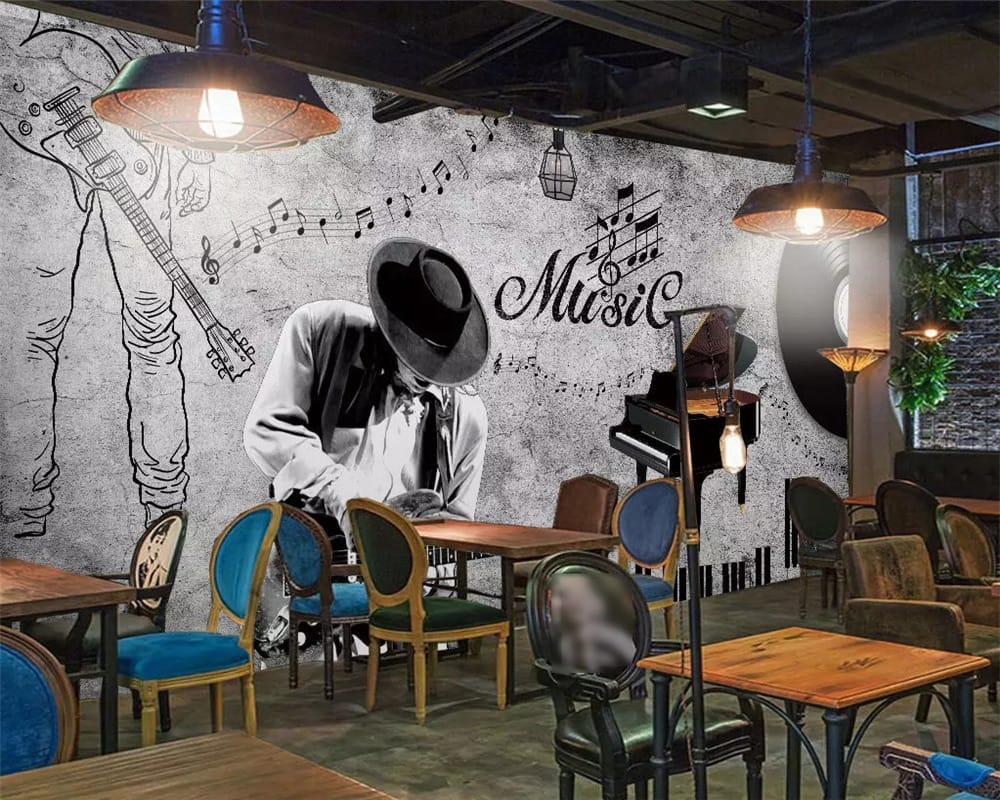 Music mural prints bring a dynamic and artistic vibe to any room. This mural features a creative blend of musical elements, including a piano, guitar, music notes, and a stylish figure, creating a visually engaging and inspiring atmosphere. The monochromatic palette with subtle details adds a touch of modern sophistication. Perfect for music lovers and those seeking a unique decor piece. Also, explore our collection of artistic murals for more expressive designs.