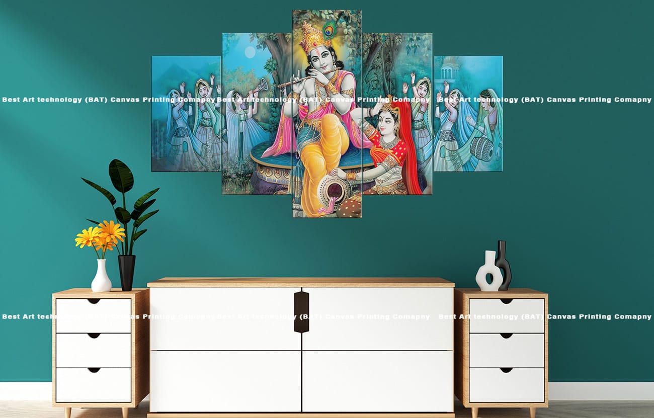 • Premium Quality Canvas Print: High-resolution multi-panel design featuring Krishna and Radha with musical gopis.