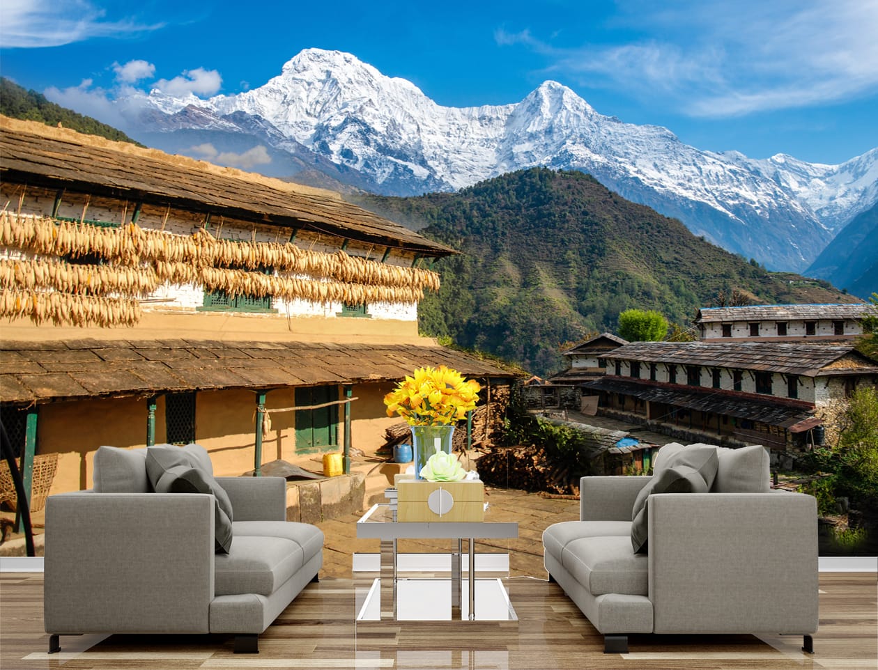 Transform your wall with the Nepal Village Himalaya Mural Print. This design captures the serene beauty of a traditional Nepali village nestled in the foothills of the snow-capped Himalayas under a clear blue sky. The rustic architecture and the stunning mountain backdrop create a peaceful and authentic scene of rural Nepal.