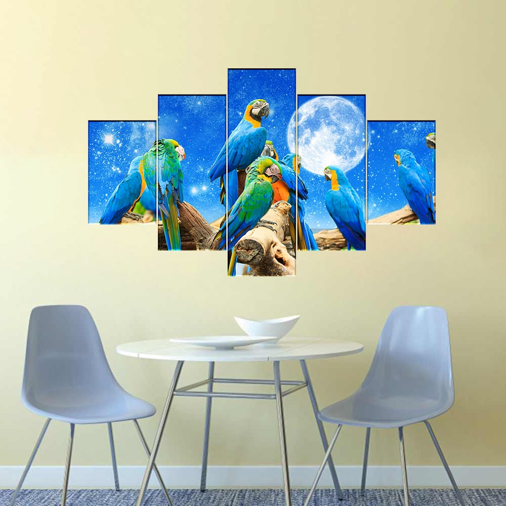 Parrots Canvas Prints offer a lively and enchanting addition to any room. This set features five individual canvas prints that together form a captivating scene of colorful parrots perched against a backdrop of a full moon and twinkling stars. The vibrant blues, greens, and yellows of the parrots create a visually stunning and cheerful atmosphere. This multi-panel set is perfect for animal lovers and those looking to add a touch of whimsy and color to their decor. Crafted with high-quality materials, these canvas prints transform your walls into a scene of tropical wonder. Also, explore our collection of animal and nature canvas prints for more inspiring designs.