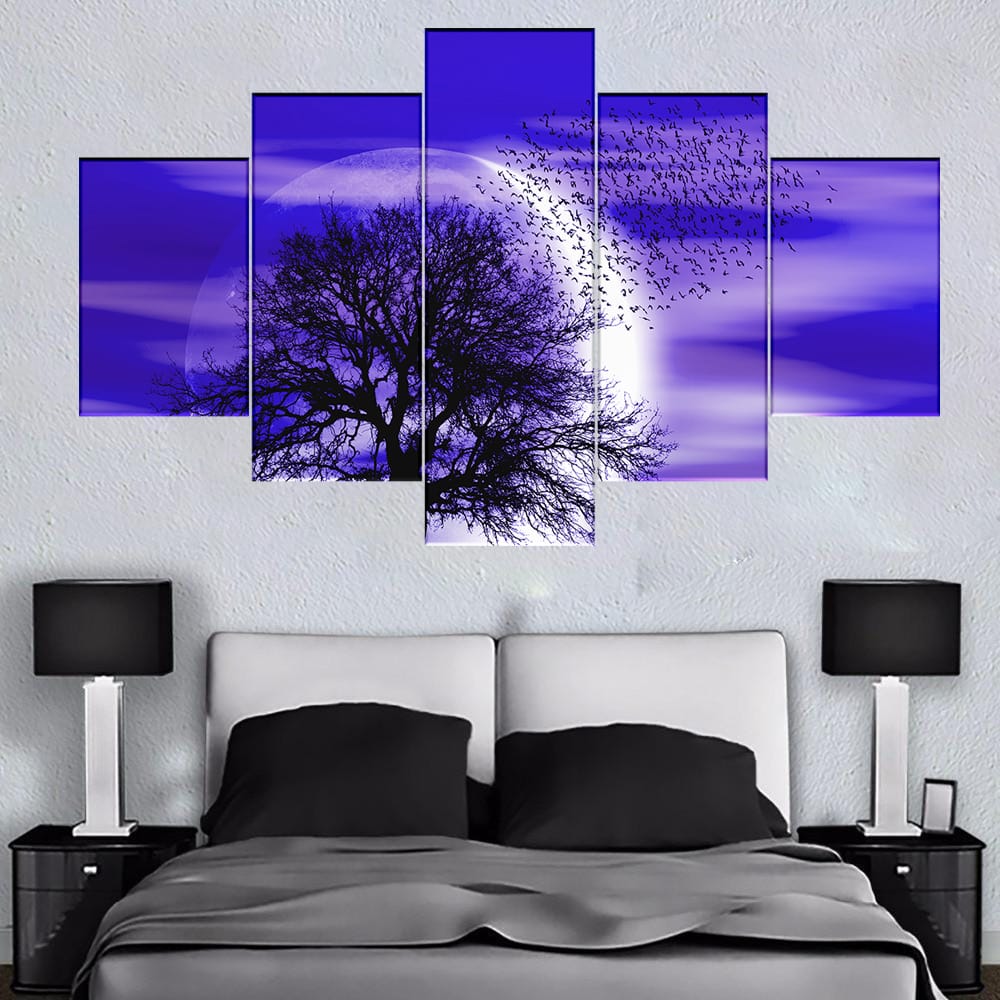 Introduce a captivating blend of serenity and mystery to your space with this multi-panel canvas art featuring the Purple Night Canvas. A striking silhouette of a bare tree stands against a luminous moon in a deep and atmospheric purple night sky, with a flock of birds gracefully taking flight away from the tree, all presented across five panels.