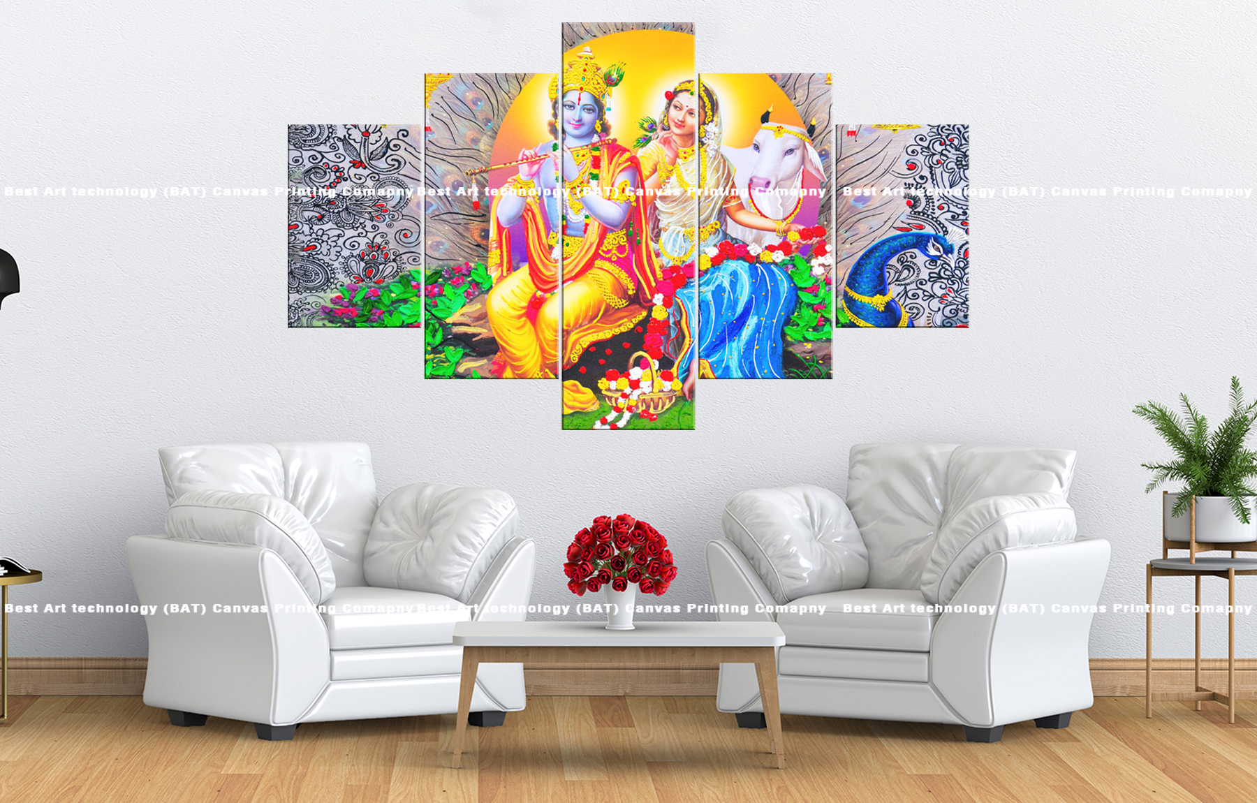 Transform your living room or prayer space with the Radha Krishna Ganesha Canvas Print. This vibrant multi-panel canvas print features Radha and Krishna, symbolizing divine love and harmony, alongside Lord Ganesha, representing blessings and auspicious beginnings. The colorful and detailed rendering creates a spiritually uplifting and joyful atmosphere.
