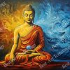 - High-Resolution Print: Captures the luminous gold Buddha, the glowing blue orb, and the distinct division and texture of the red and blue background.