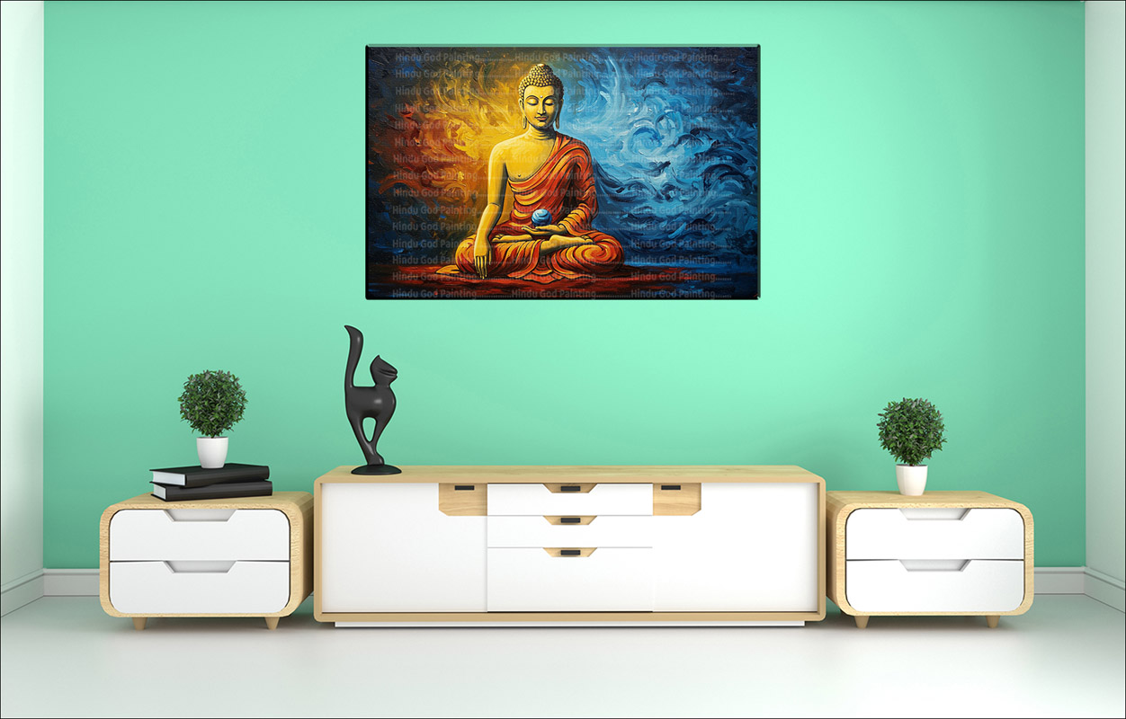 - High-Resolution Print: Captures the luminous gold Buddha, the glowing blue orb, and the distinct division and texture of the red and blue background.