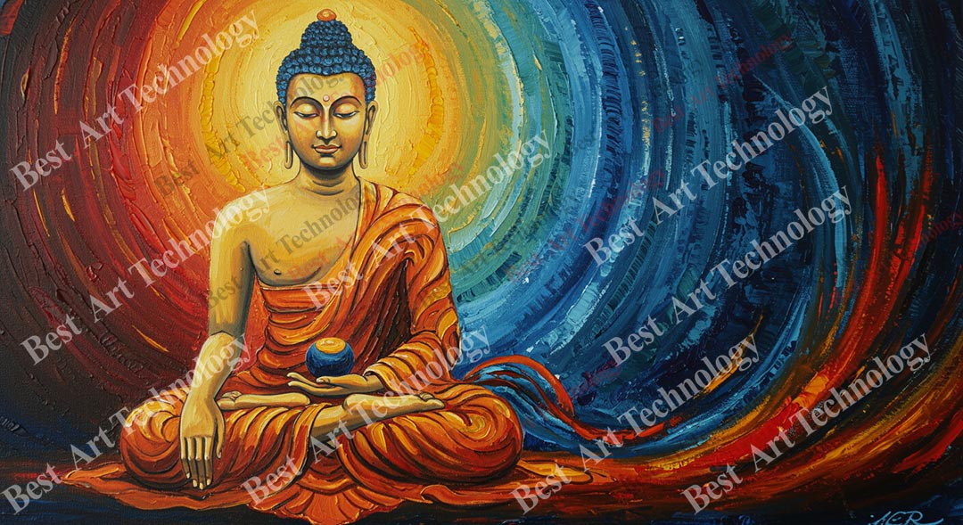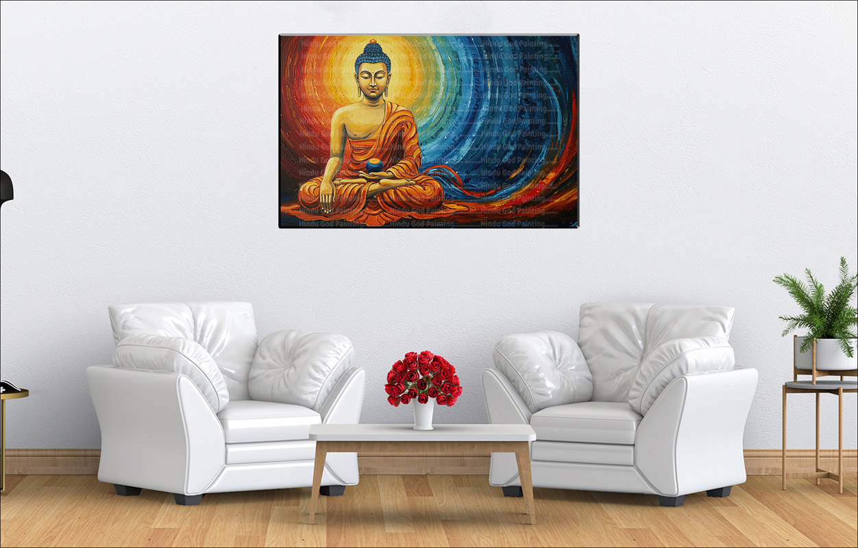 - High-Resolution Print: Captures the serene Buddha, the lotus, and the vibrant swirling light in red, orange, and blue tones.