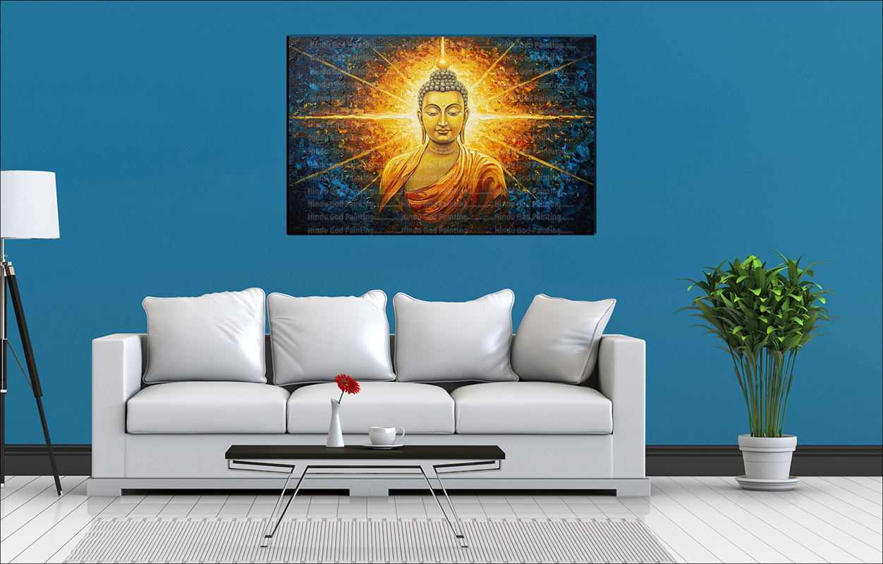 - High-Resolution Print: Captures the luminous gold Buddha, the emanating light, and the subtle golden script against the textured dark blue background.