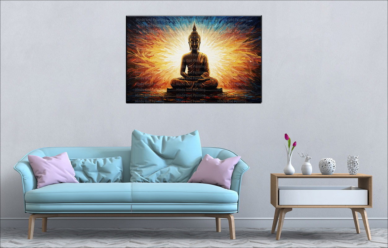 - High-Resolution Print: Captures the luminous gold Buddha, the lotus, and the emanating light against the textured blue and orange background.