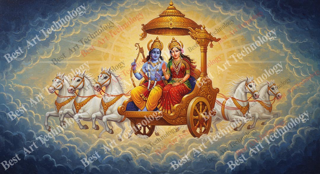 Invite the inspiring scene of divine guidance and courage into your space with this majestic canvas art. Lord Krishna acts as the charioteer for Arjuna, guiding their powerful chariot drawn by white horses through a divine and swirling sky. This Ram Sita Chariot Canvas embodies wisdom, guidance, and the strength to face life’s challenges.