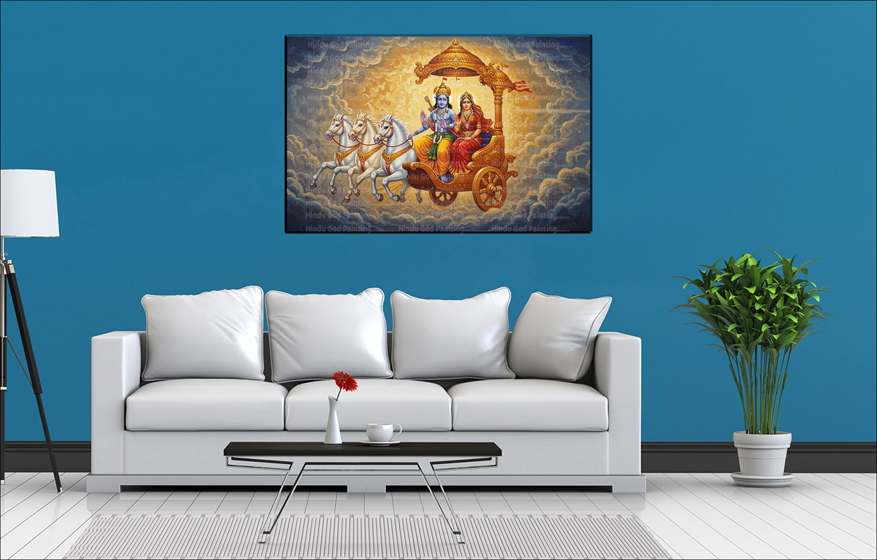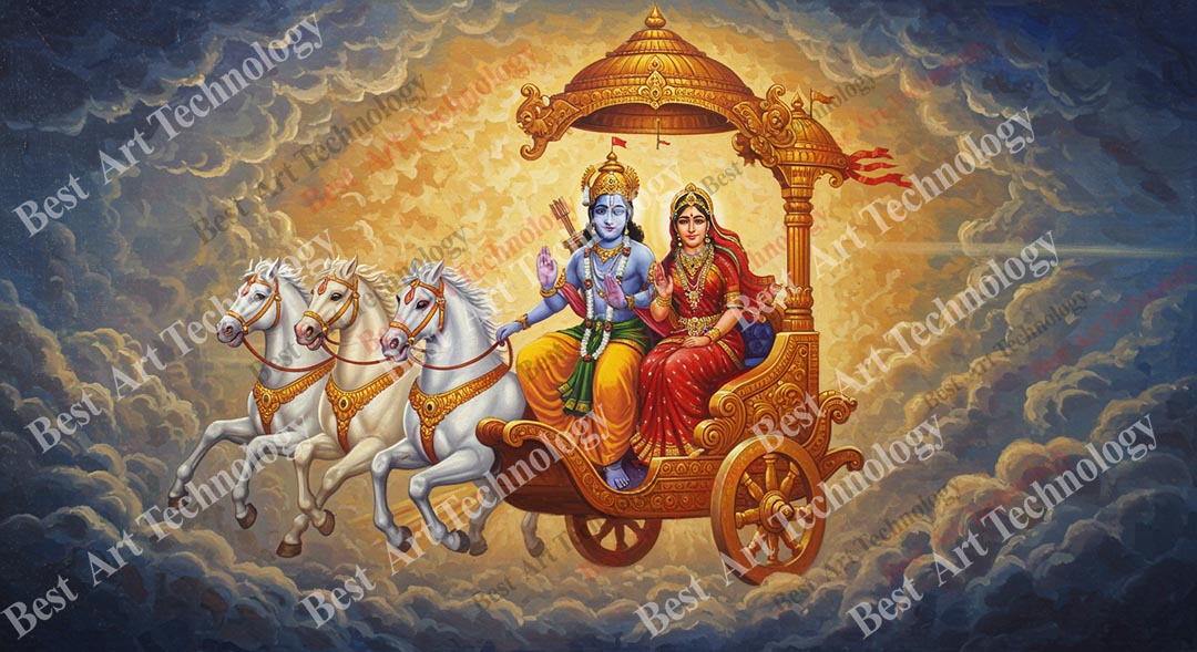 - High-Resolution Print: Captures the majestic chariot, Lord Rama and Sita, and the serene cloudy backdrop.
