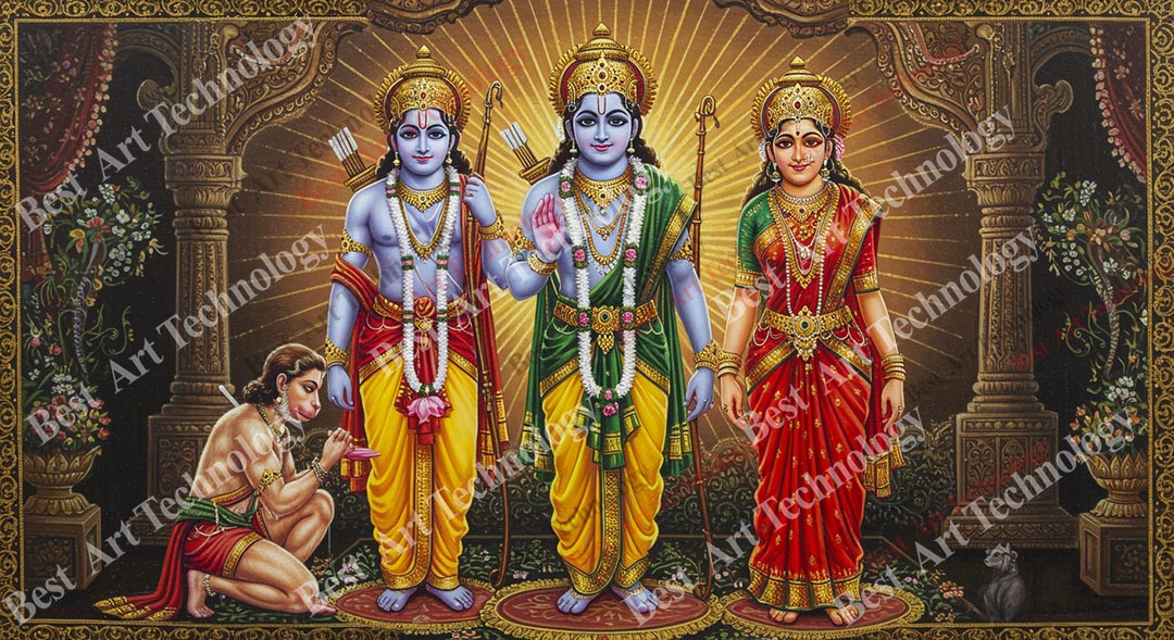 - High-Resolution Print: Captures the majestic figures of Rama, Sita, and Lakshmana, along with Hanuman’s devoted posture.