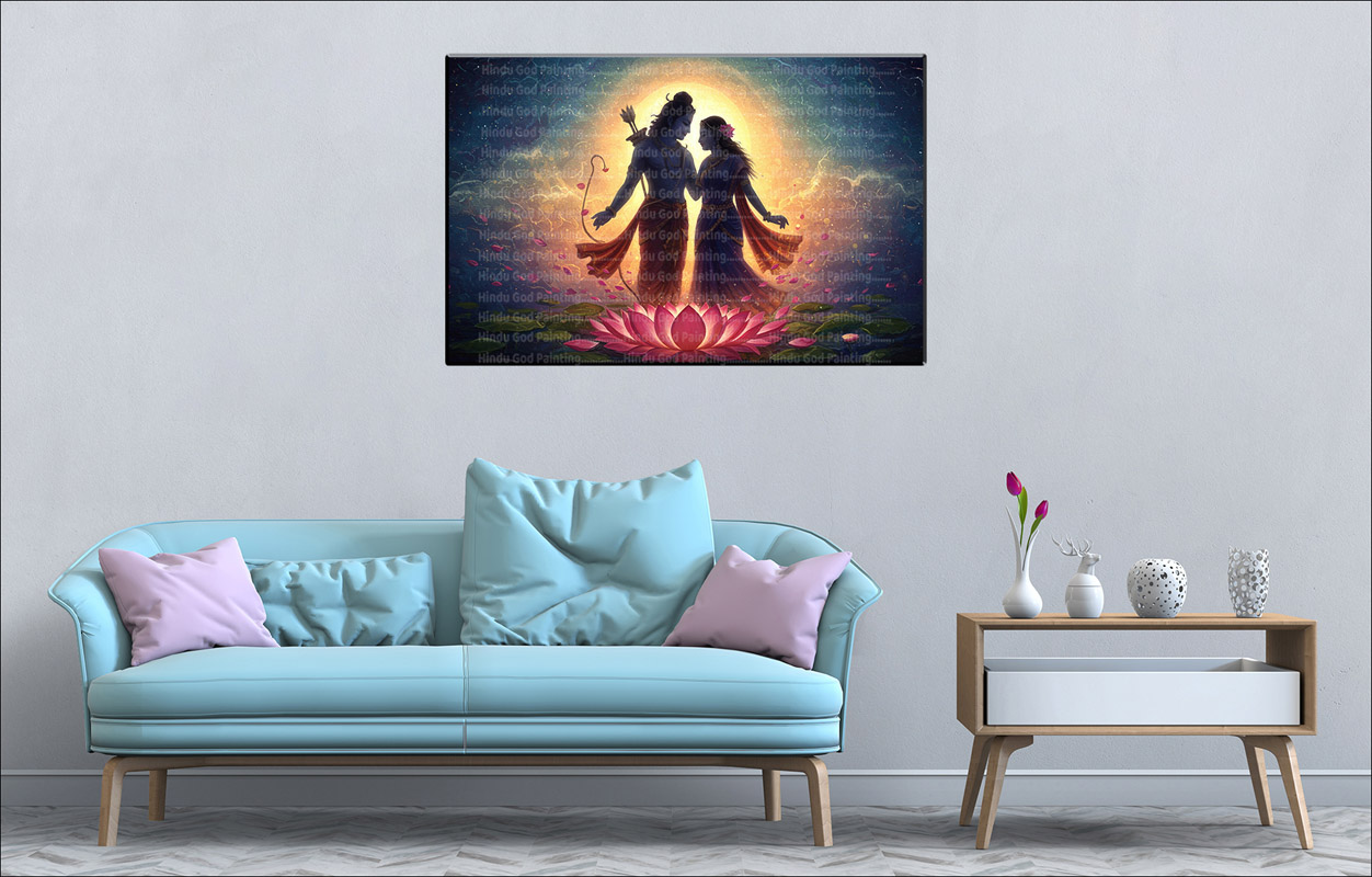- High-Resolution Print: Captures the elegant silhouettes of Rama and Sita on the lotus with the radiant golden light.