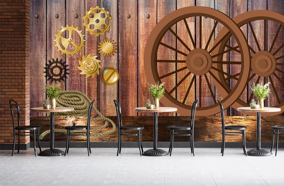 Transform your space with our Rustic Gears and Wheels Mural. This mural features a captivating design of industrial gears and wagon wheels against a rustic wood panel backdrop, creating a vintage industrial aesthetic. Each mural is printed with high-quality materials and vibrant inks, ensuring a lasting and visually appealing addition to your decor. Perfect for cafes, restaurants, bars, or any space seeking a unique and nostalgic vibe, this mural adds a touch of character and charm. Display it in your dining area, living room, or commercial space to create a captivating focal point. Explore our collection of vintage and industrial murals for more unique and stylish designs.
