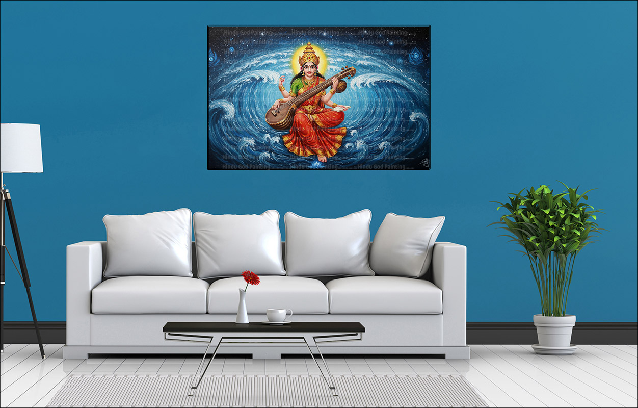- High-Resolution Print: Captures the serene image of Goddess Saraswati with her veena amidst the stylized ocean waves, set against a starry backdrop.