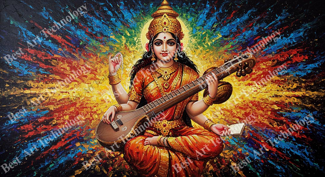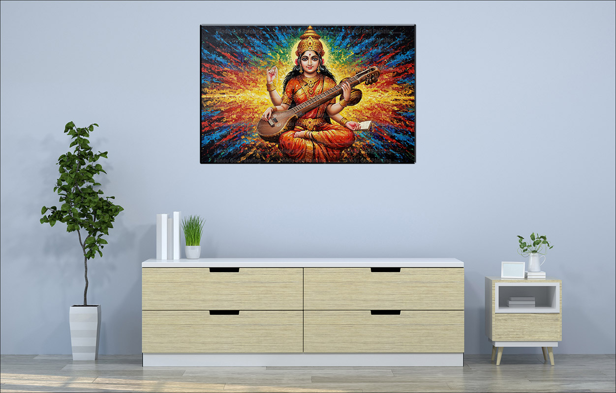 - High-Resolution Print: Captures the serene image of Goddess Saraswati with her veena and book, enveloped in a dynamic and colorful abstract aura.