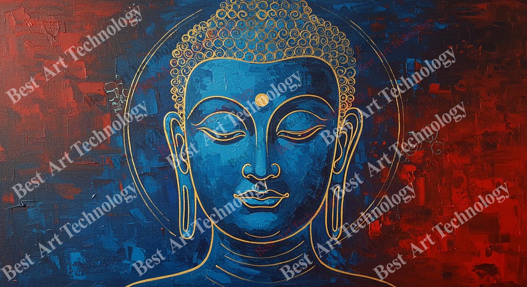 - High-Resolution Print: Captures the serene blue Buddha with the delicate gold outline and the textured background with its color transition and subtle script.