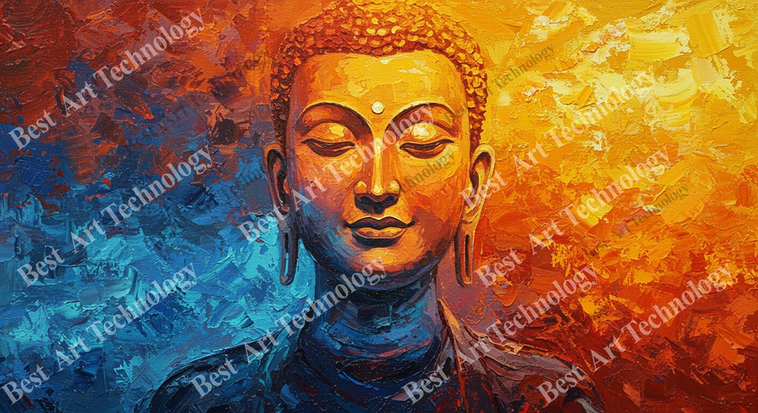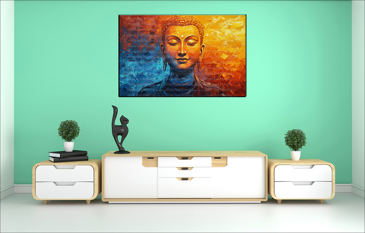 • High-Resolution Print: Captures the serene expression of Buddha and the distinct division and texture of the blue and orange background with subtle script.