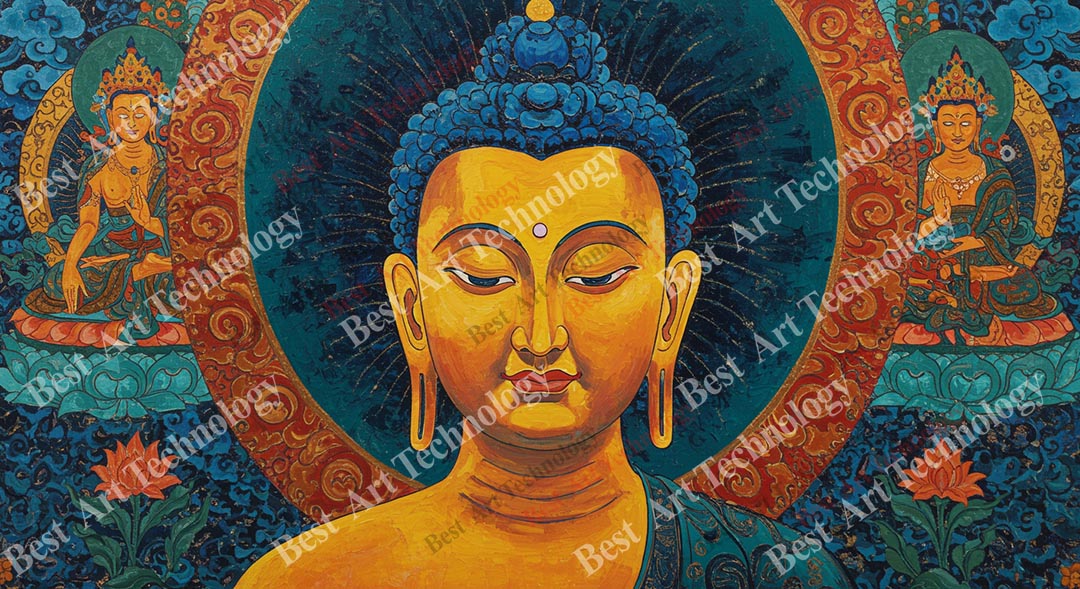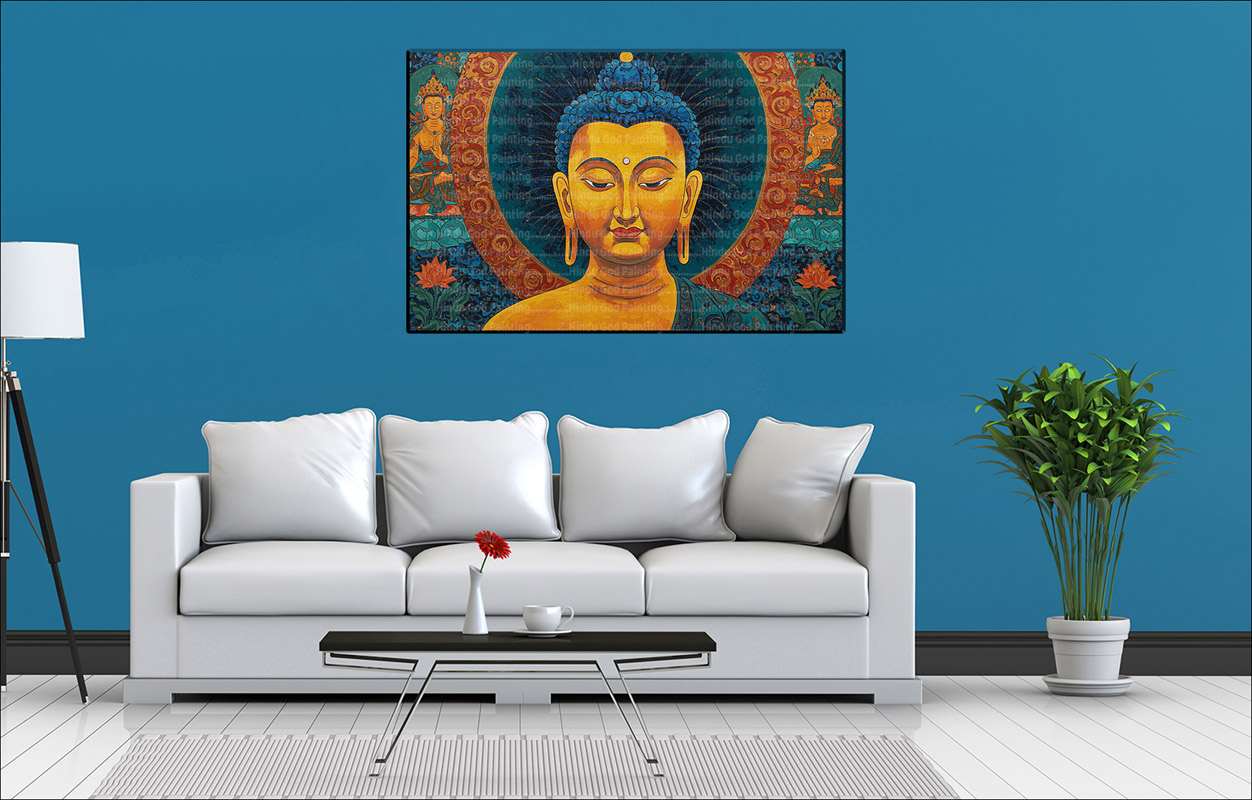 - High-Resolution Print: Captures the serene gold and blue Buddha, the ornate halo, the lotus flowers, and the textured teal background.
