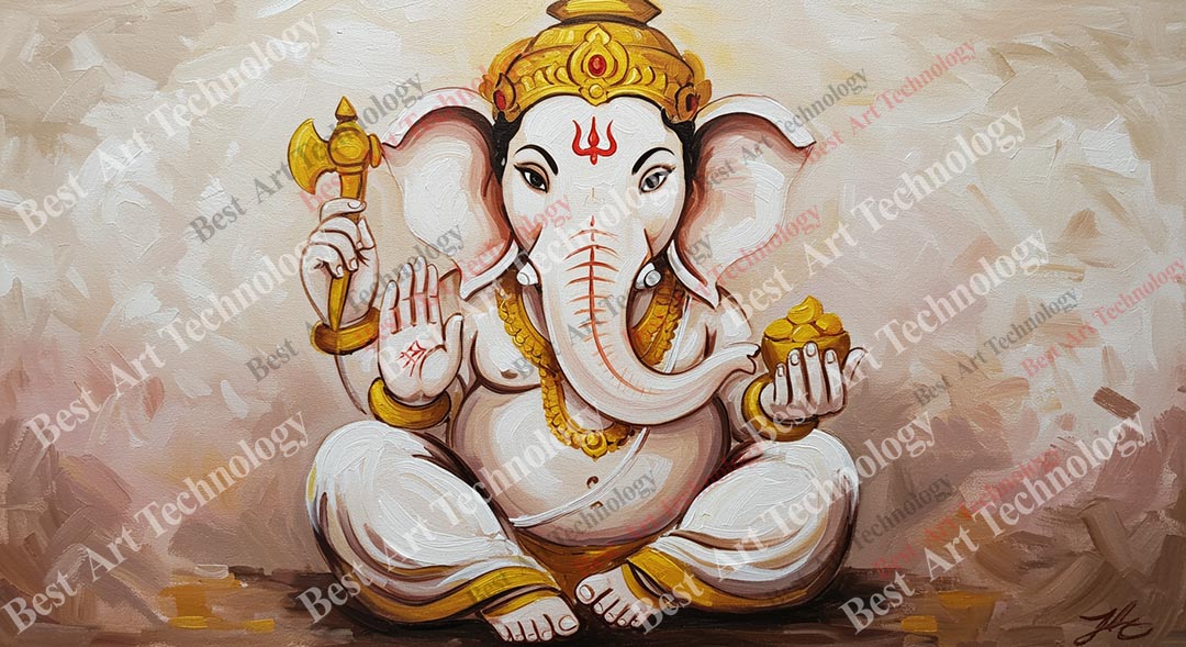 • High-Resolution Print: Captures the peaceful painted depiction of Lord Ganesh, his axe, and modaks against the textured light background.