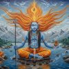 Invite a sense of tranquil meditation into your space with this single-panel canvas art of Lord Shiva. Featuring Shiva seated peacefully in meditation in a serene flowing river, with his vibrant orange hair flowing upwards, set against a majestic mountain landscape and with a devotee figure nearby, this Serene River Meditating Shiva Canvas embodies a calming and spiritual atmosphere.
