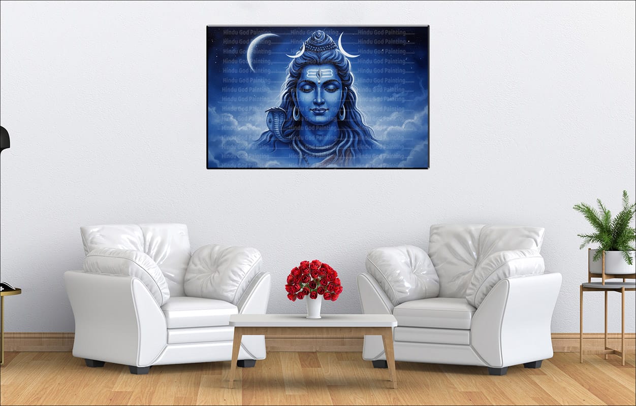 - High-Resolution Print: Captures the serene expression of Shiva and the tranquil beauty of the crescent moon, snake, and cloudy blue backdrop.