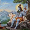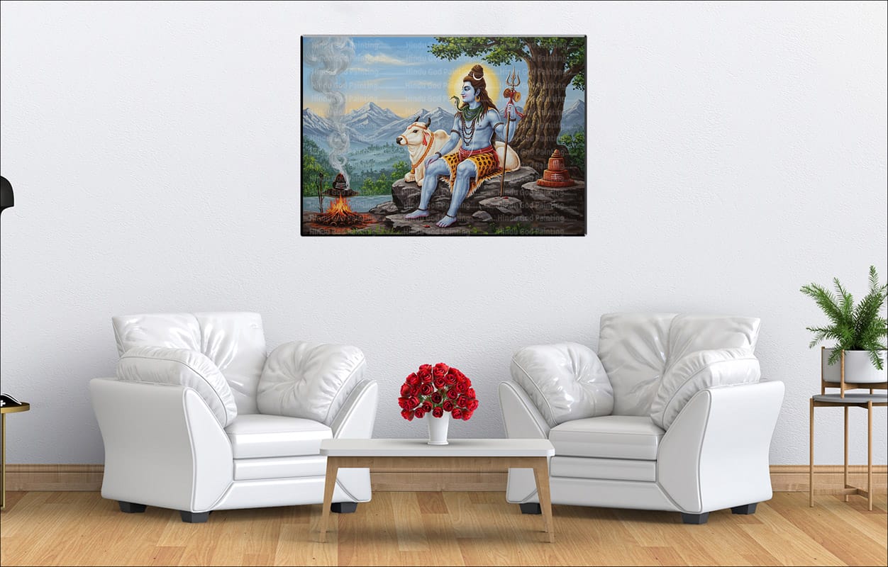 - High-Resolution Print: Captures the serene expressions of Shiva and Nandi and the tranquil beauty of the mountain landscape and peaceful setting with the subtle smoke from the fire.