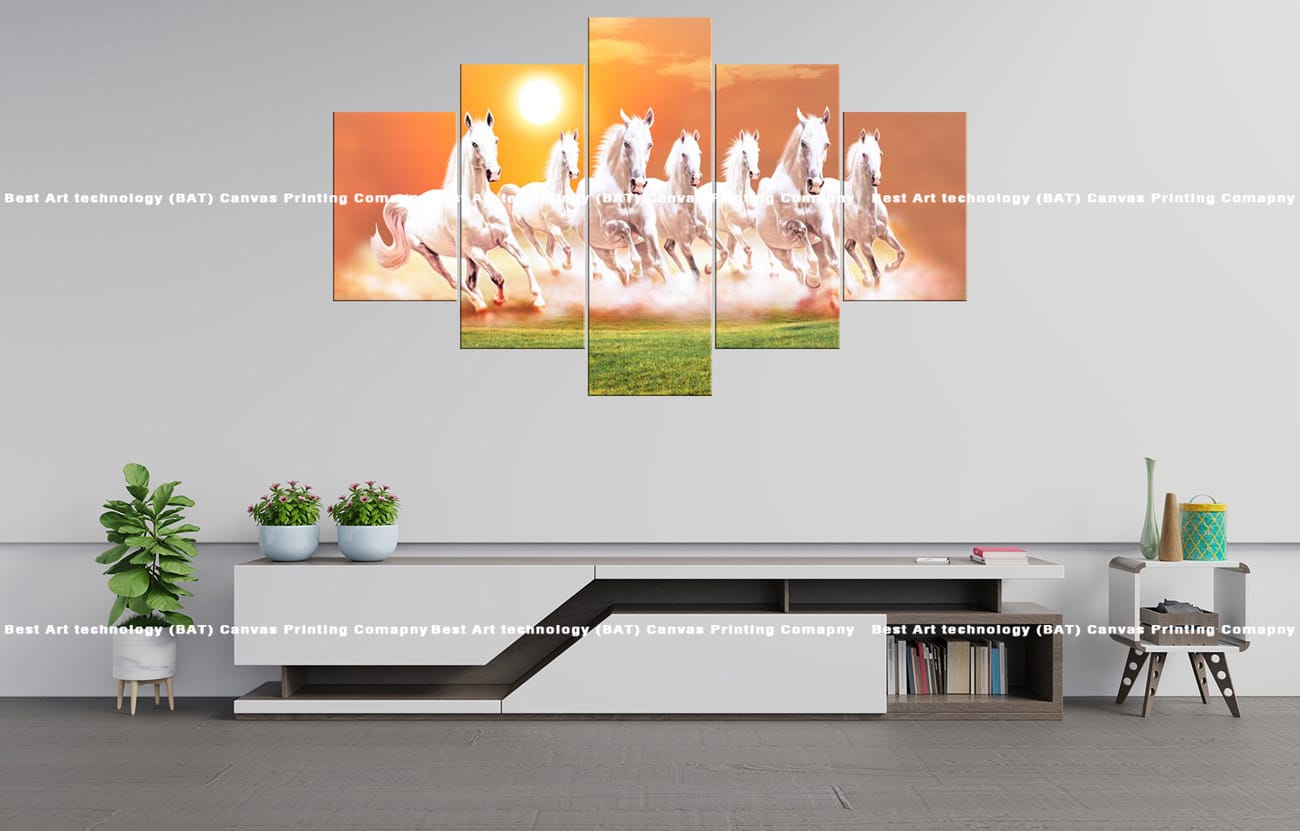 Transform your space with the vibrant energy of the Seven White Horses Sunrise Canvas. This magnificent multi-panel canvas art captures seven powerful white horses as they gallop across a lush green field, bathed in the warm golden light of the rising sun. Perfect for adding a touch of wild beauty and invigorating energy to any room.
