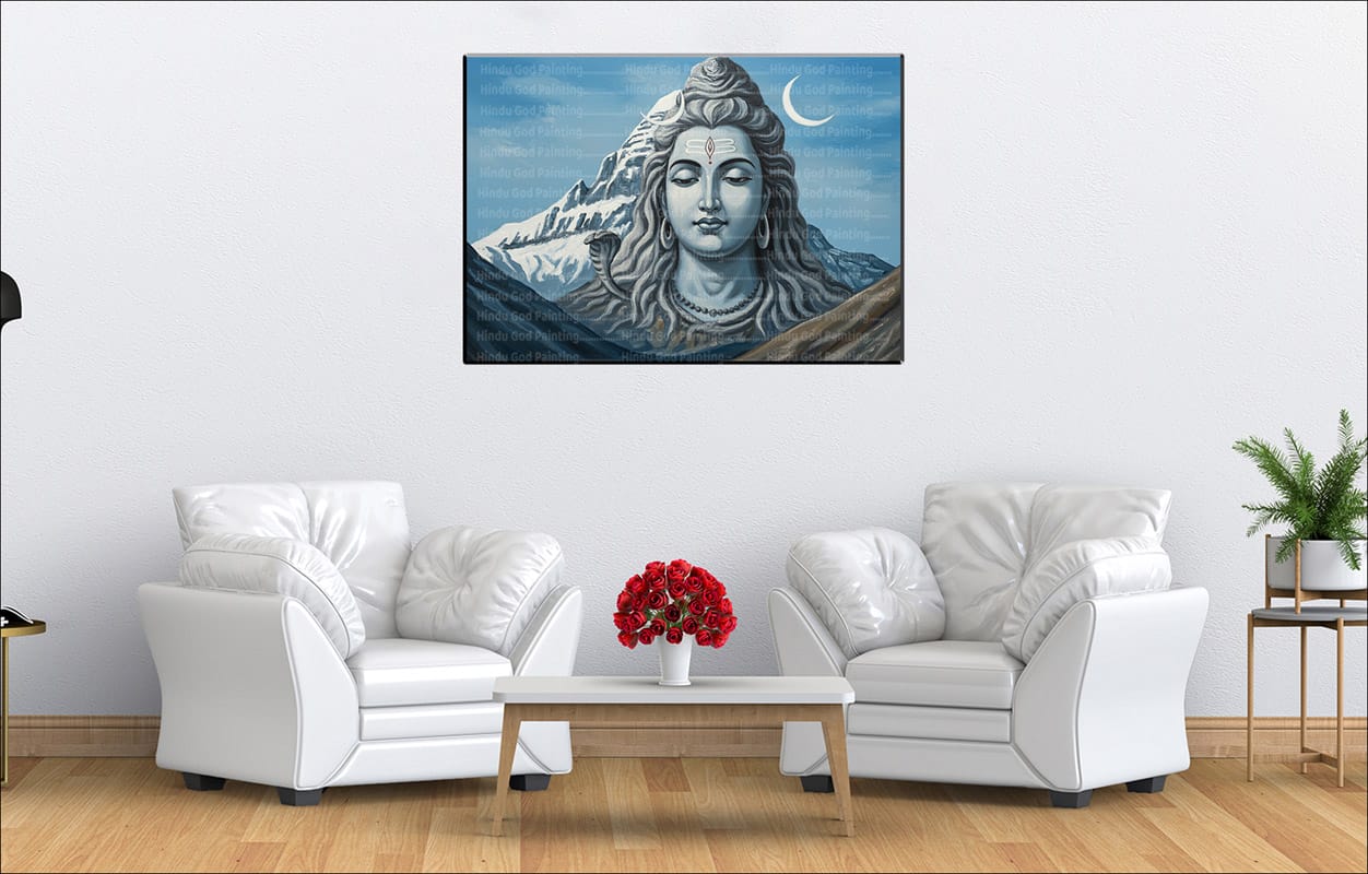 - High-Resolution Print: Captures the serene expression of Shiva, the crescent moon detail, and the tranquil mountain scenery.