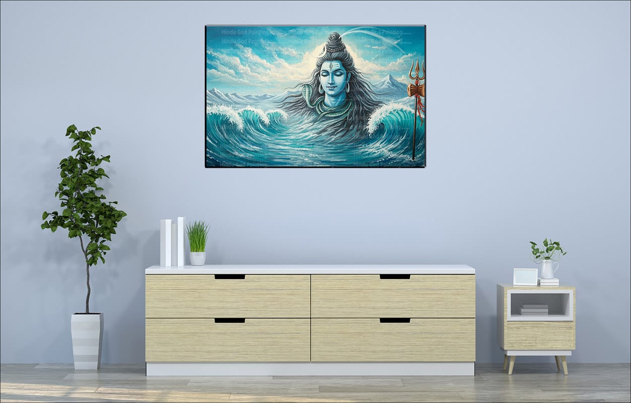 Experience the peaceful yet powerful presence of Lord Shiva with this single-panel canvas art. Depicting Shiva emerging from swirling and vibrant blue waters against a serene, light-filled sky with distant mountains, this Shiva Emerging Serene Water Canvas embodies a sense of divine emergence and tranquil spiritual energy.