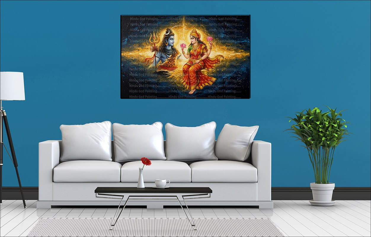 - High-Resolution Print: Captures the loving presence of Shiva and Parvati, the radiant golden aura, and the textured dark background with subtle text.