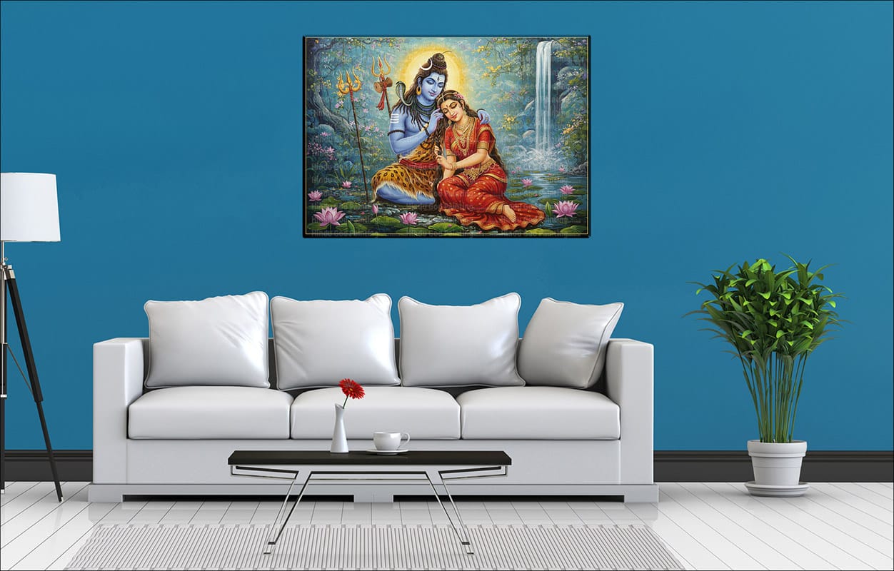 - High-Resolution Print: Captures the loving expressions of Shiva and Parvati, the beauty of the waterfall, and the surrounding natural elements.