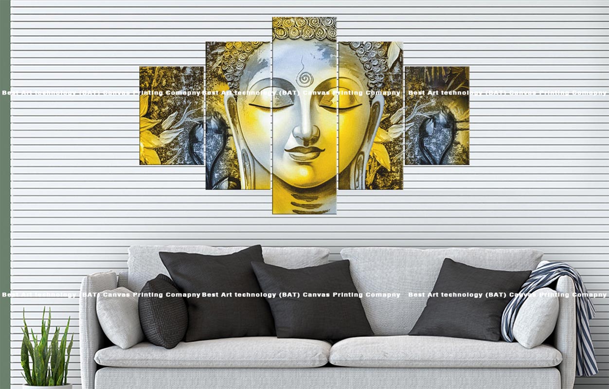 Introduce a modern and serene aesthetic to your space with this multi-panel canvas art featuring the Split Tone Buddha Canvas. A peaceful Buddha face is presented with a striking split color design, featuring cool silver tones on one side and warm gold tones on the other, across five panels.