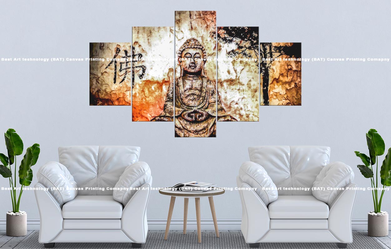 Introduce a sense of ancient serenity and artistic texture to your space with this multi-panel canvas art featuring the Stone Carved Buddha Canvas. A peaceful Buddha figure is depicted in a weathered stone carving style, complete with ancient script characters and natural earthy textures across five panels.