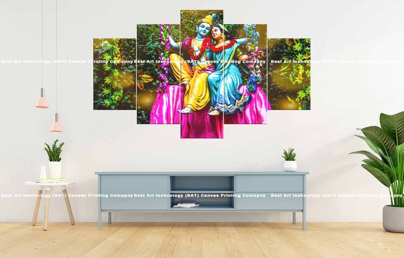 - Premium Quality Canvas Print: High-resolution multi-panel design featuring Radha and Krishna on a swing in a garden.