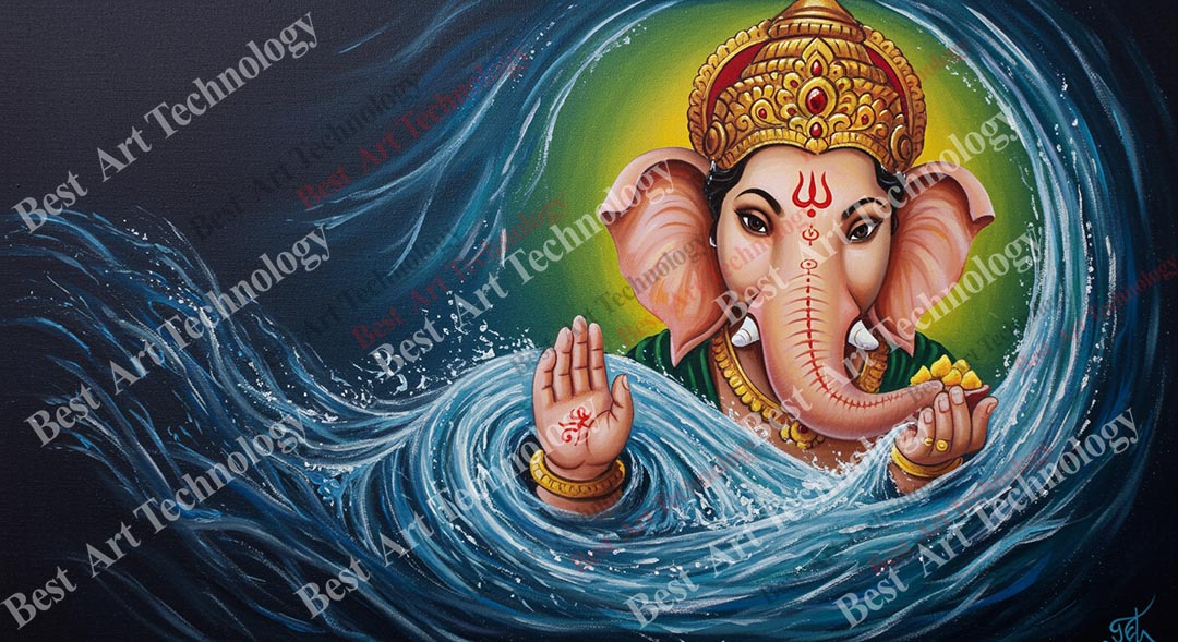 - High-Resolution Print: Captures the dynamic image of Lord Ganesh amidst swirling blue water, holding a lotus and modaks, and the dark background with teal accents.