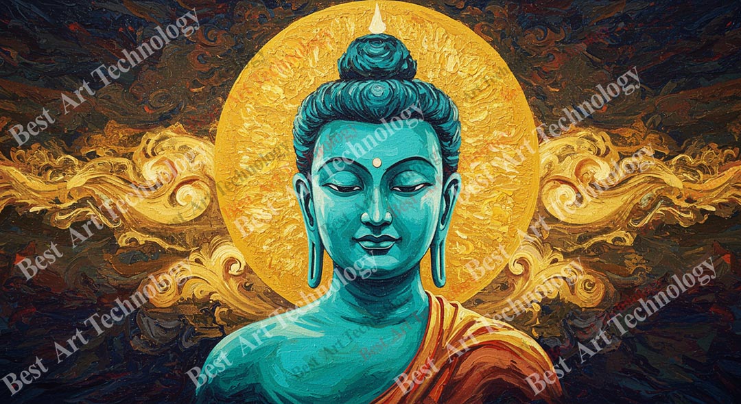 - High-Resolution Print: Captures the serene teal Buddha, the radiant golden aura, and the intricate ornate background details.
