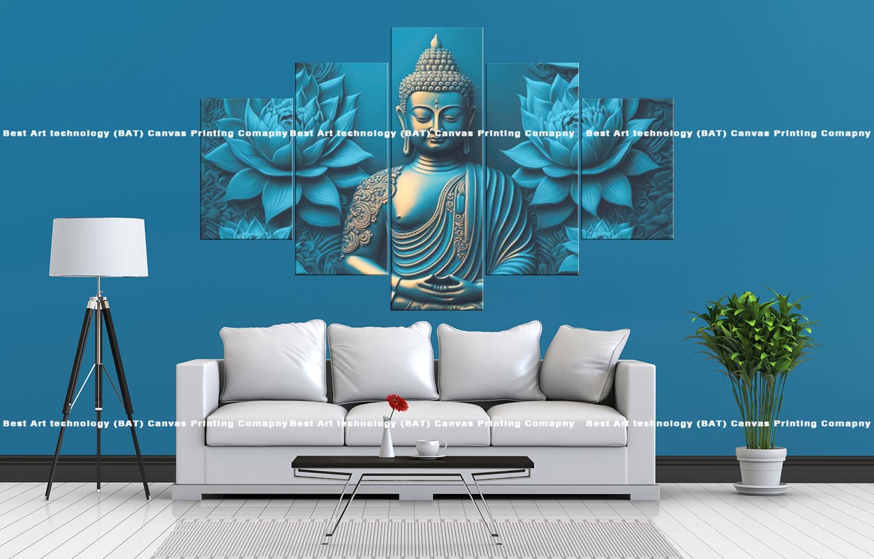 Introduce a calming and contemporary touch to your space with this multi-panel canvas art featuring the Teal Buddha Lotus Canvas. A serene Buddha figure in shades of teal meditates gracefully amidst stylized lotus flowers, presented across five panels.
