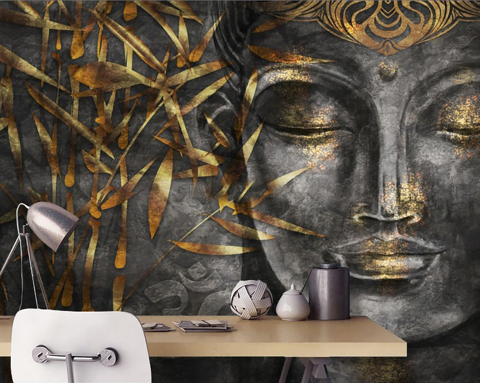 Transform your wall with the Textured Buddha Bamboo Wallpaper. This artistic design features a serene Buddha face with a textured, stone-like appearance, partially overlaid with stylized golden bamboo stalks. The blend of spiritual imagery and natural elements creates a tranquil and grounding atmosphere in any room.