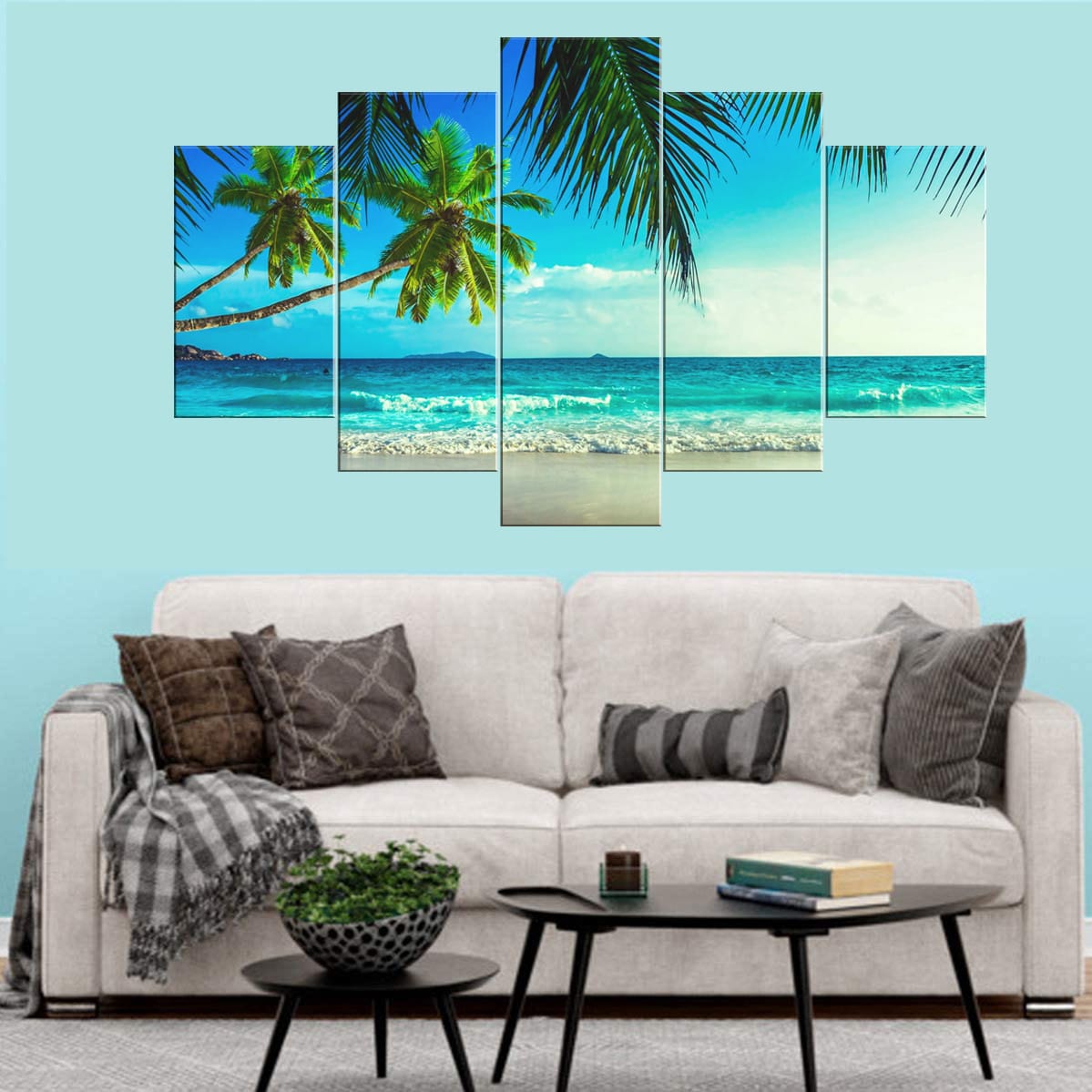 - Premium Quality Canvas Print: High-resolution multi-panel design featuring a tropical beach and palm trees.