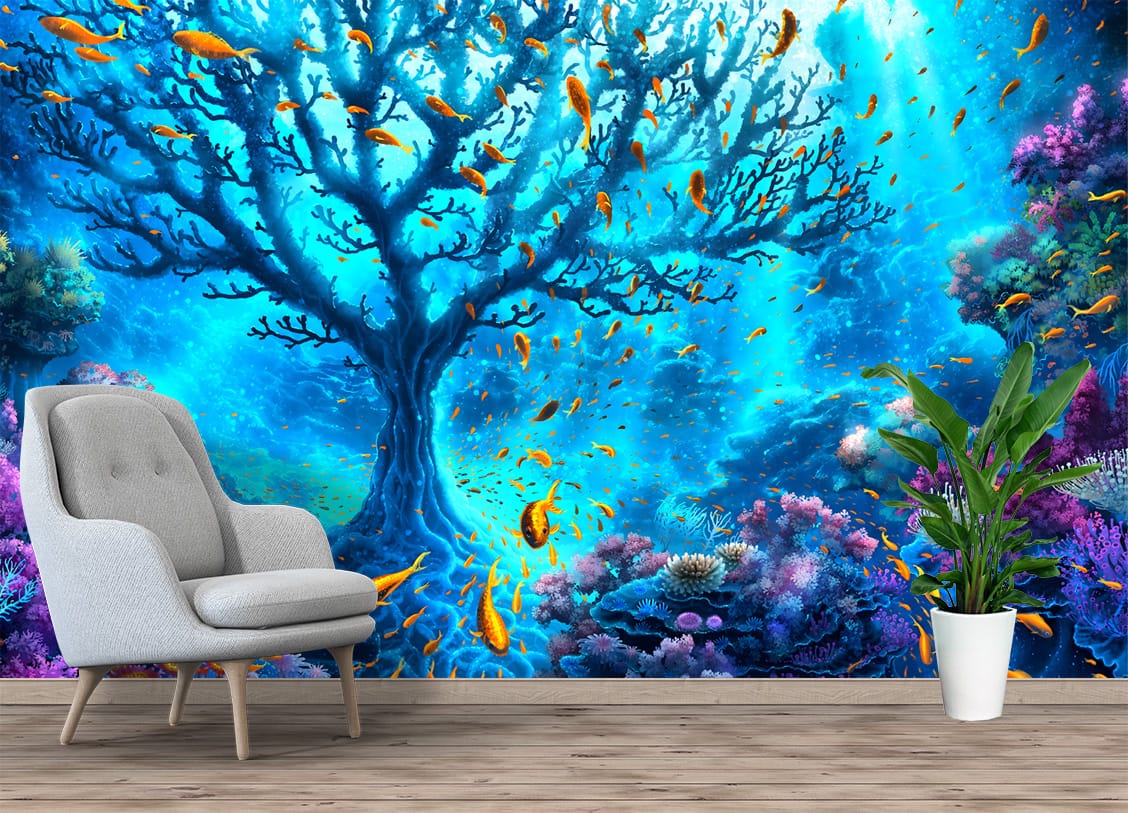Transform your space with our Underwater Tree Fish Mural Print. This mural features a stylized tree growing from a coral reef, surrounded by swimming fish and vibrant underwater flora. Creating a whimsical and vibrant atmosphere, this mural adds a touch of fantasy to any room. High-quality prints ensure a lasting and visually stunning decor. Ideal for those seeking unique and imaginative decor. Custom Canvas Prints Nepal options are available. Explore our underwater and fantasy murals for captivating designs.