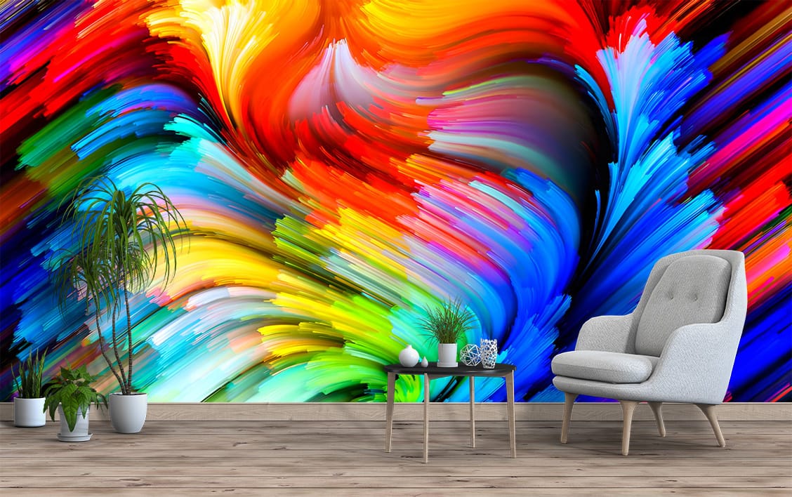 Transform your wall with the energetic Vibrant Feather Flow Mural Print. This design features a dynamic and abstract composition of flowing strokes, reminiscent of colorful feathers swirling together. The vibrant spectrum of colors creates a sense of movement and artistic energy, making this mural a captivating focal point for any modern interior.