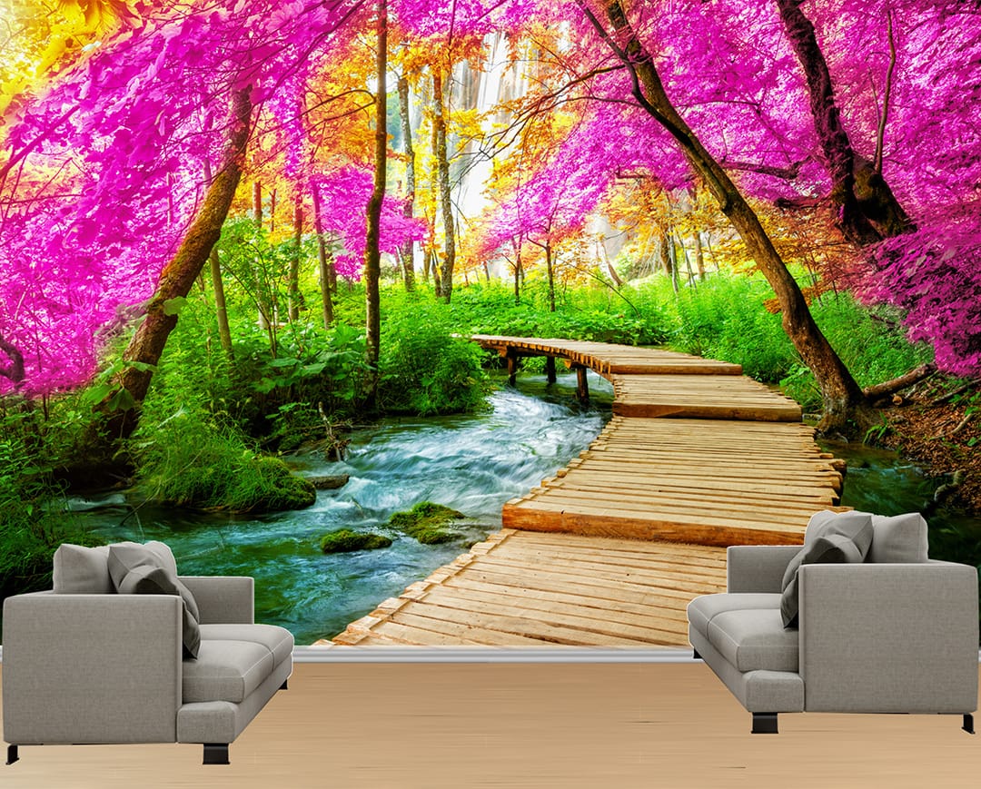 - Premium Quality Mural: High-resolution design showcasing a forest with vibrant pink blossoms, a wooden walkway, and a stream.