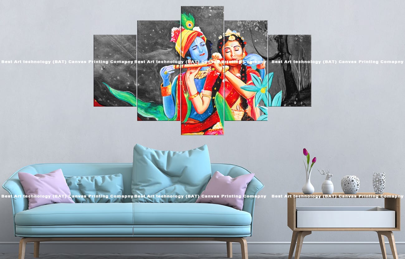- Premium Quality Canvas Print: High-resolution multi-panel design featuring Radha and Krishna in vibrant colors against a monochrome background.