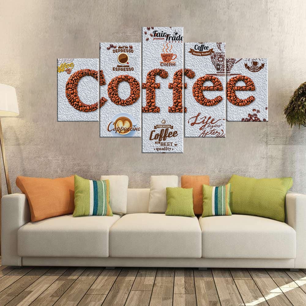 Transform your space with the charming Vintage Coffee Collage Canvas Print. This multi-panel canvas art showcases a delightful collection of vintage-style typography, coffee-related words like “Coffee,” “Espresso,” “Cappuccino,” and “Fair Trade,” along with classic coffee cup and bean illustrations. The warm, inviting tones make it a perfect addition to any kitchen or coffee nook.