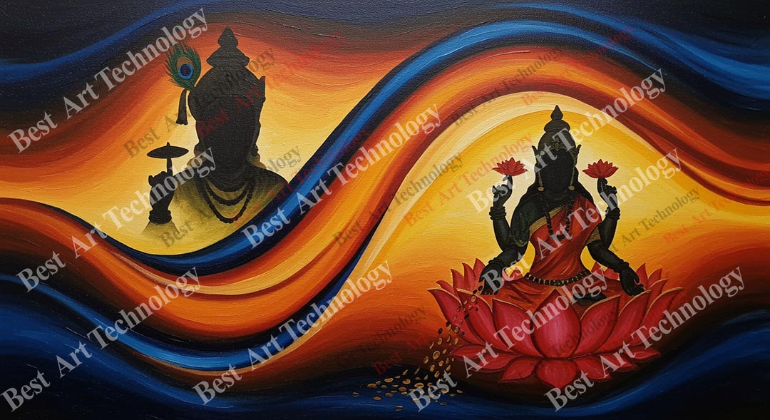 - High-Resolution Print: Captures the distinct silhouettes of Lord Shiva and Goddess Lakshmi and the dynamic flow of orange and blue energy.