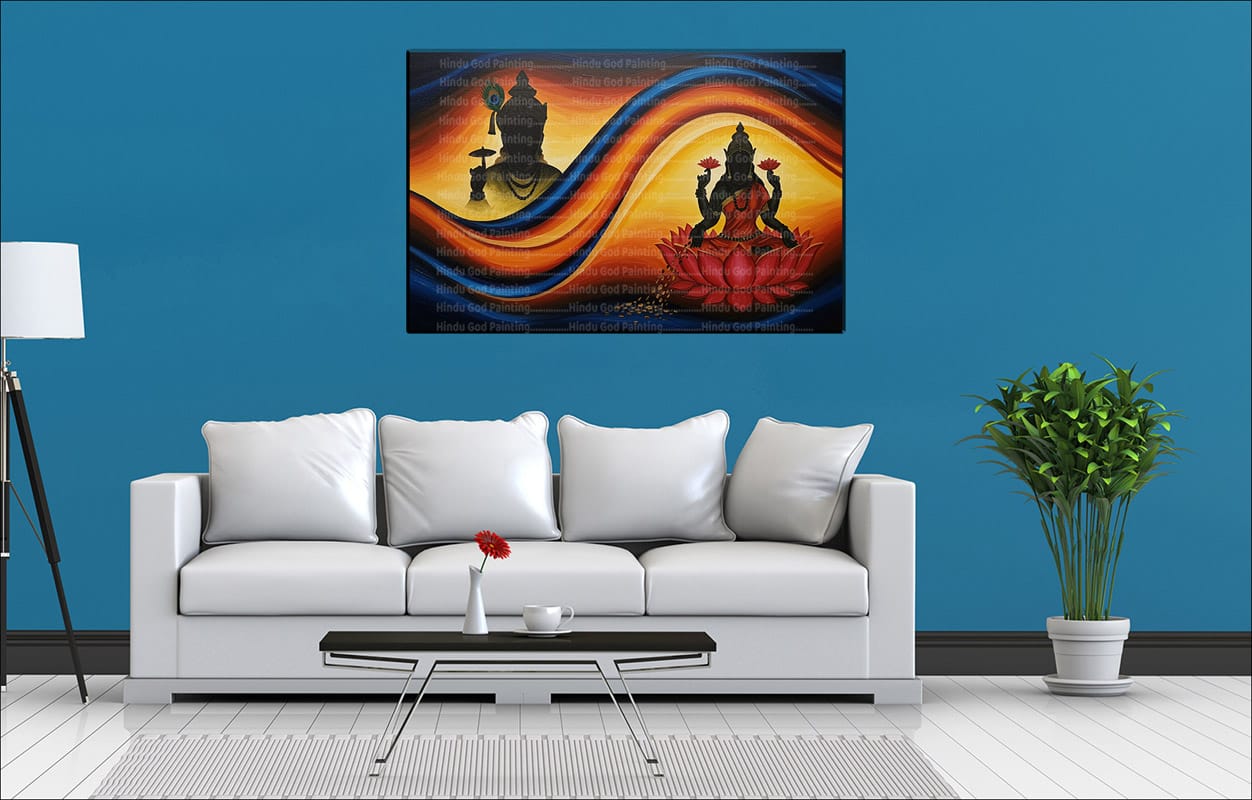 Invite the divine balance of masculine and feminine energies into your space with this captivating canvas art. Silhouettes of Lord Shiva and Goddess Lakshmi are depicted facing each other, separated yet connected by flowing bands of vibrant orange and tranquil blue energy. This Vishnu Lakshmi Energy Canvas symbolizes the harmonious interplay of power and grace, destruction and creation, and the essential balance within the cosmos.