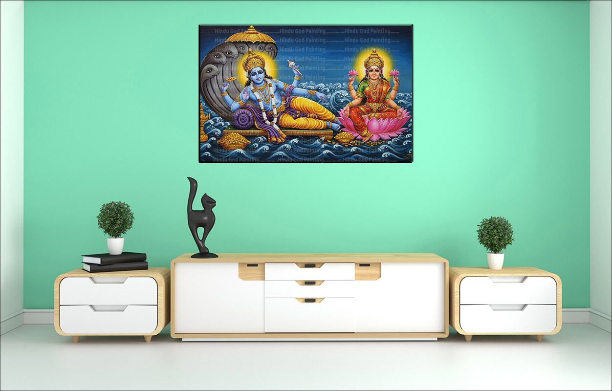 - High-Resolution Print: Captures the serene image of Lord Vishnu reclining on Sheshnag and Goddess Lakshmi seated on the lotus in the ocean.