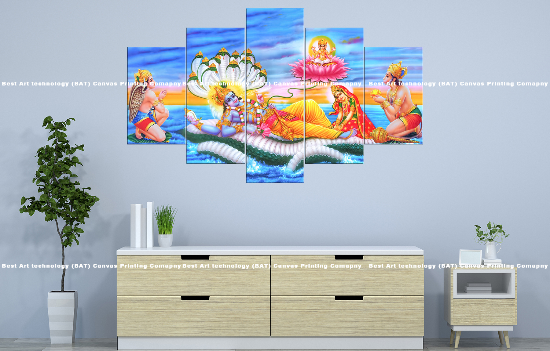 Transform your living room or prayer space with the Vishnu Laxmi Sheshnag Canvas Print. This striking multi-panel canvas print features Lord Vishnu and Goddess Laxmi resting on Sheshnag, symbolizing divine blessings, prosperity, and protection. The vibrant colors and detailed rendering create a powerful and auspicious atmosphere.